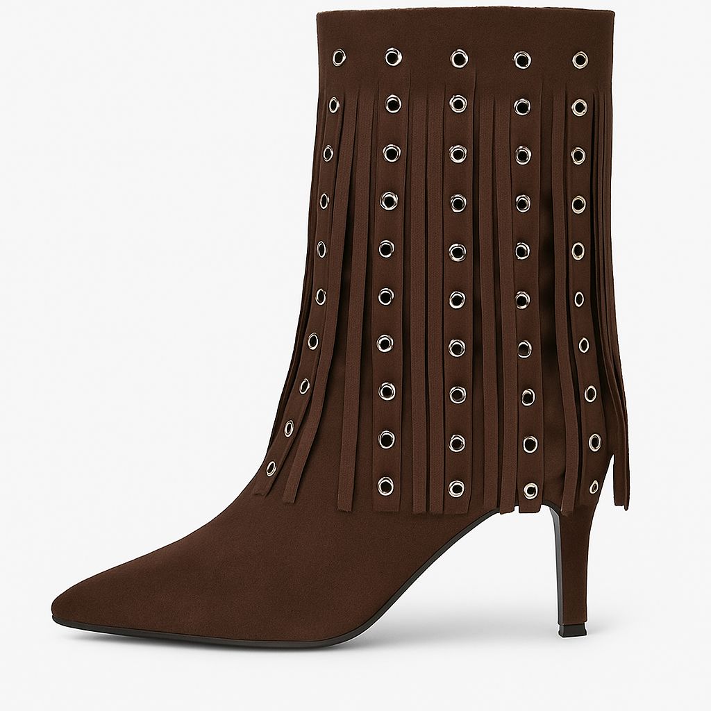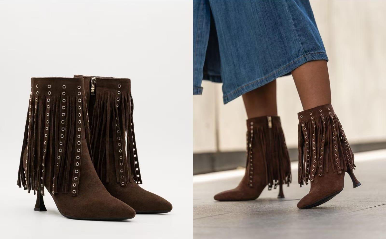 Bota castanha com franjas e tachas. Com fecho lateral.