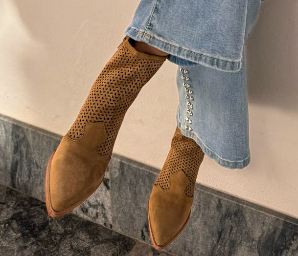 Bota de camurça em cor camel, com efeito de rede no tornozelo.