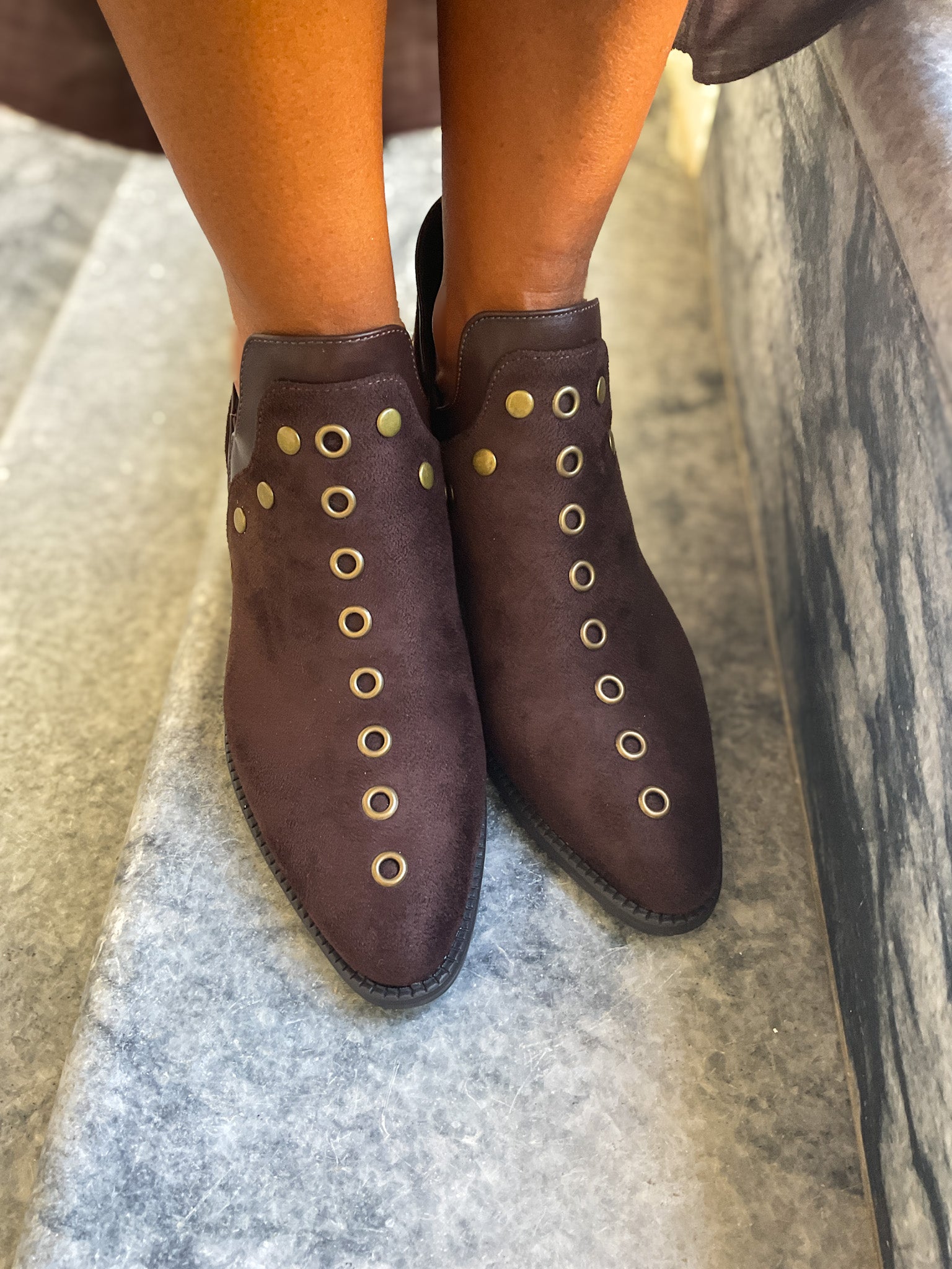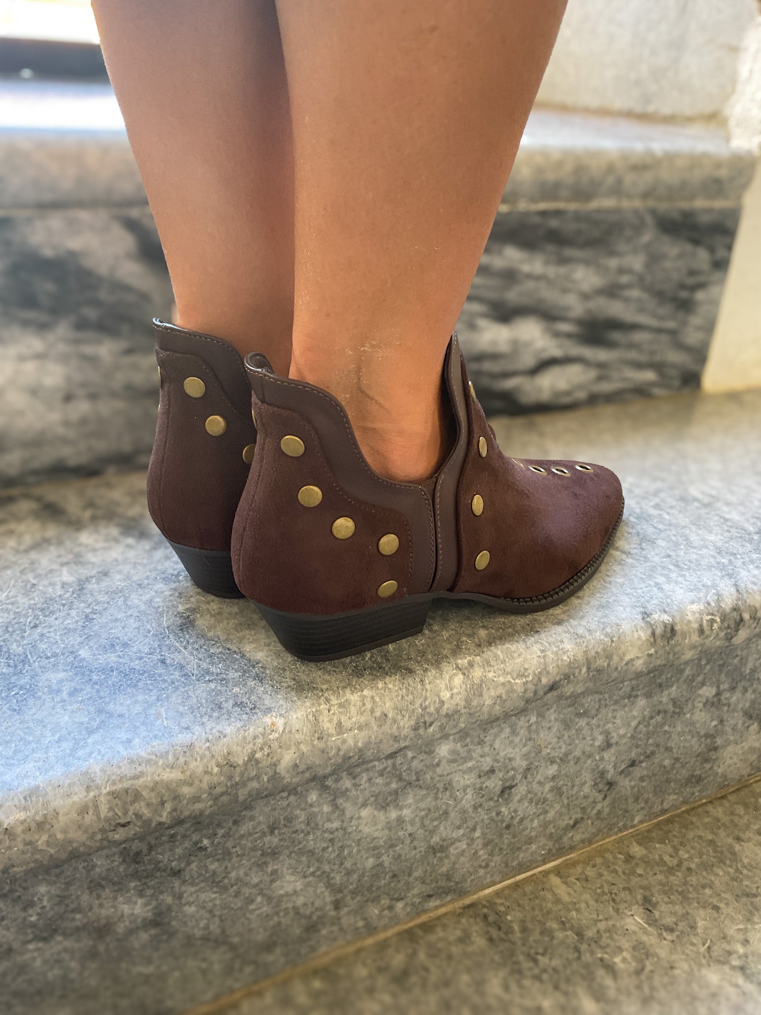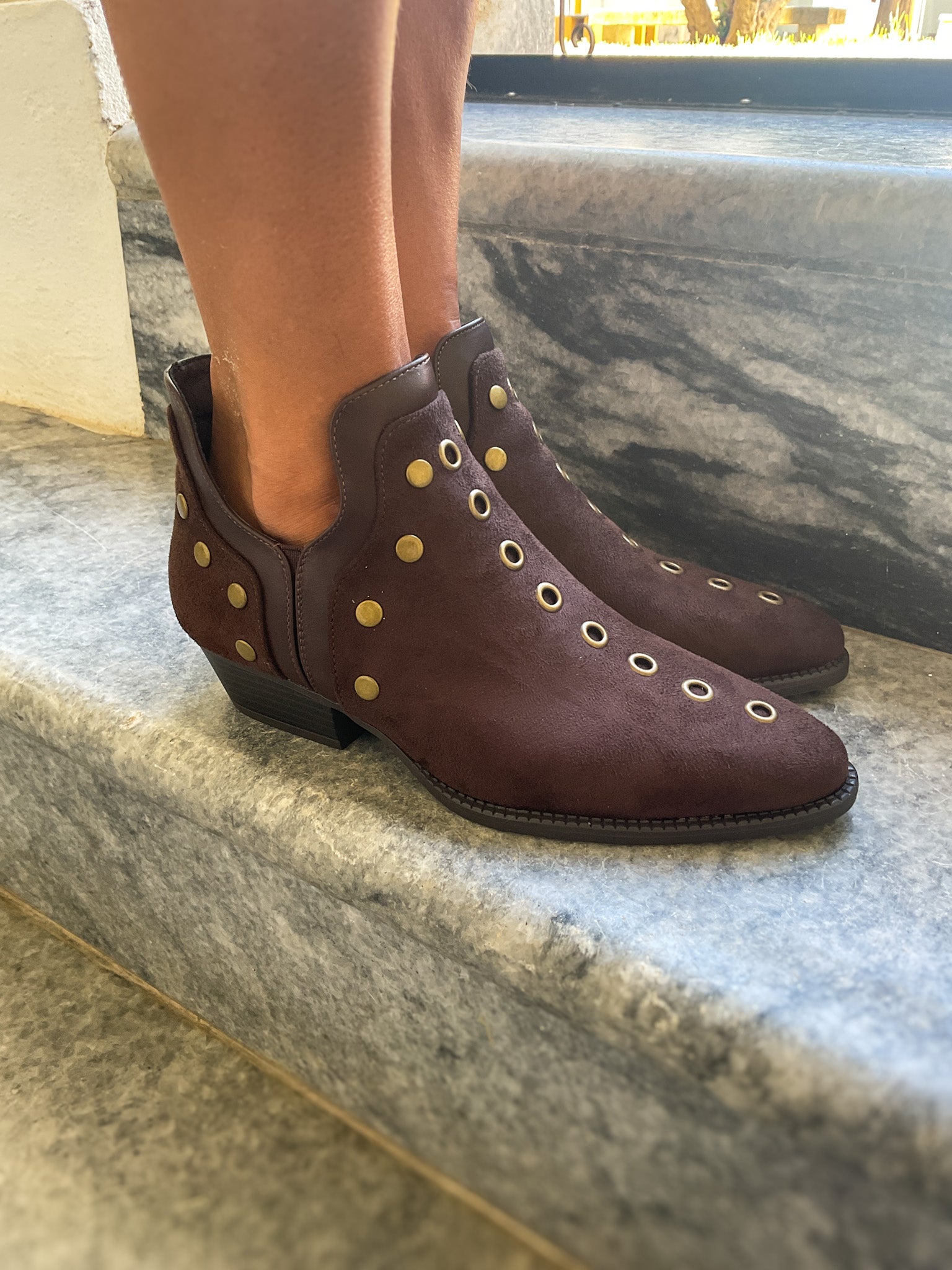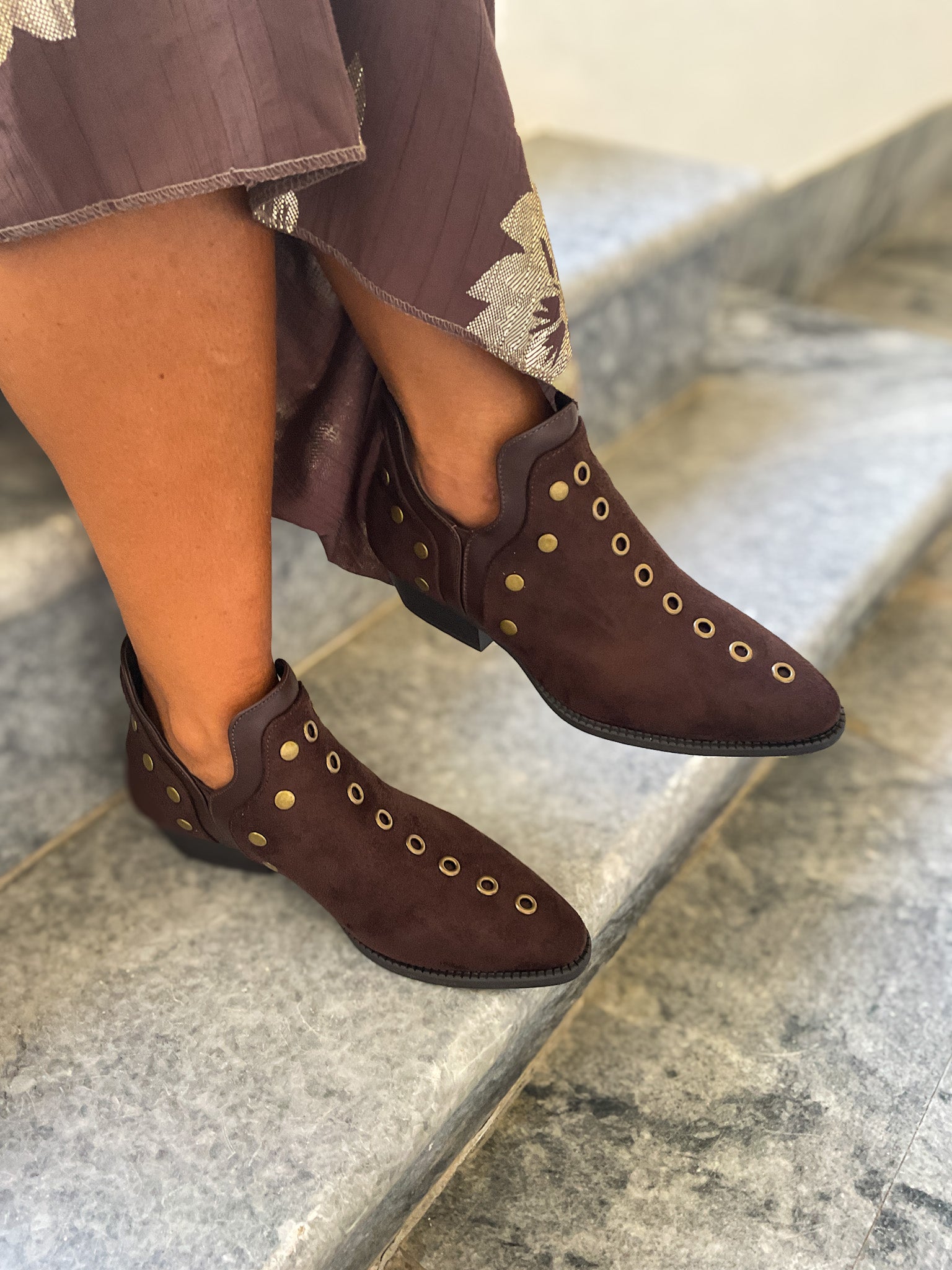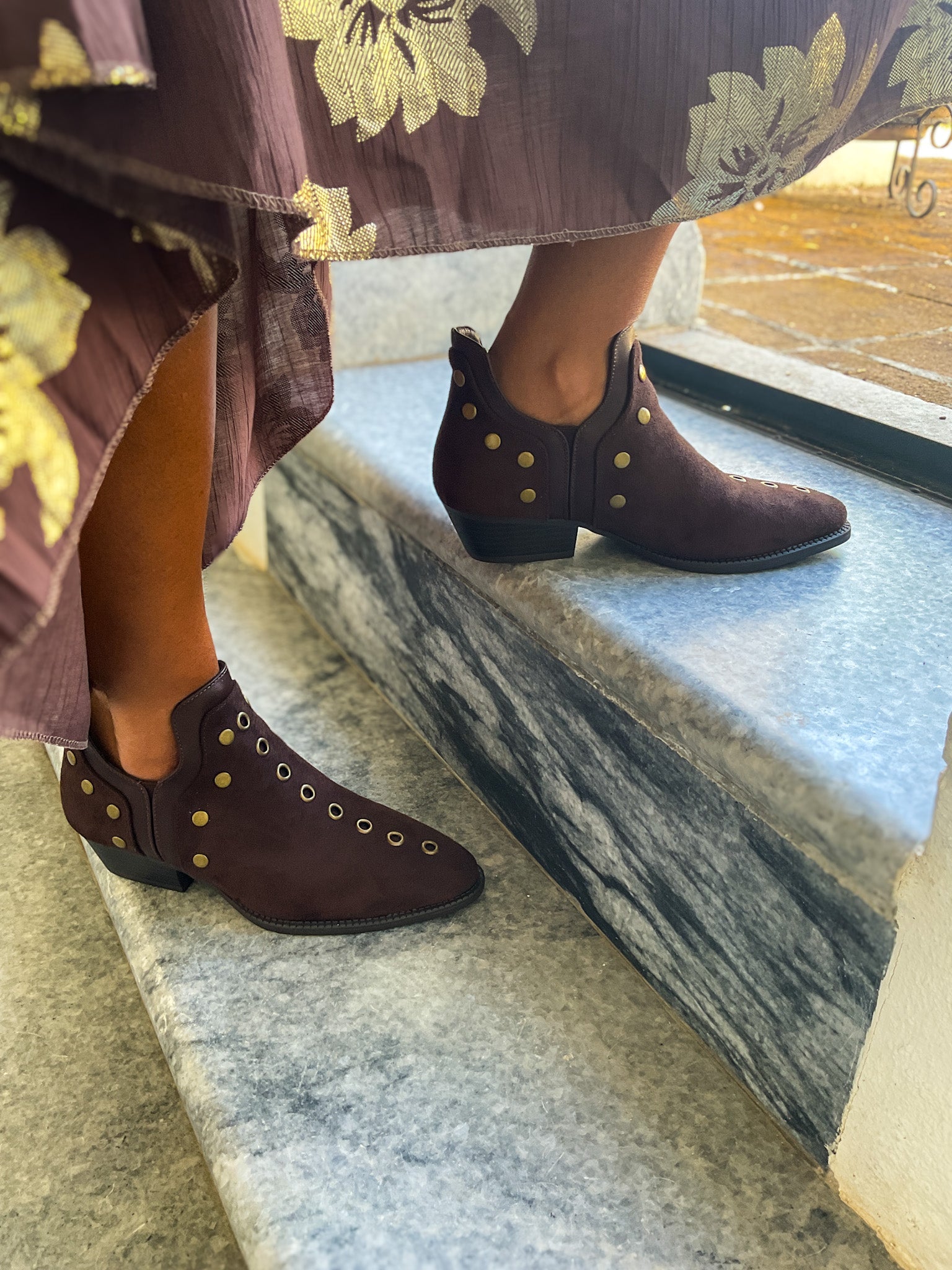 Botim de cor chocolate com tachas.