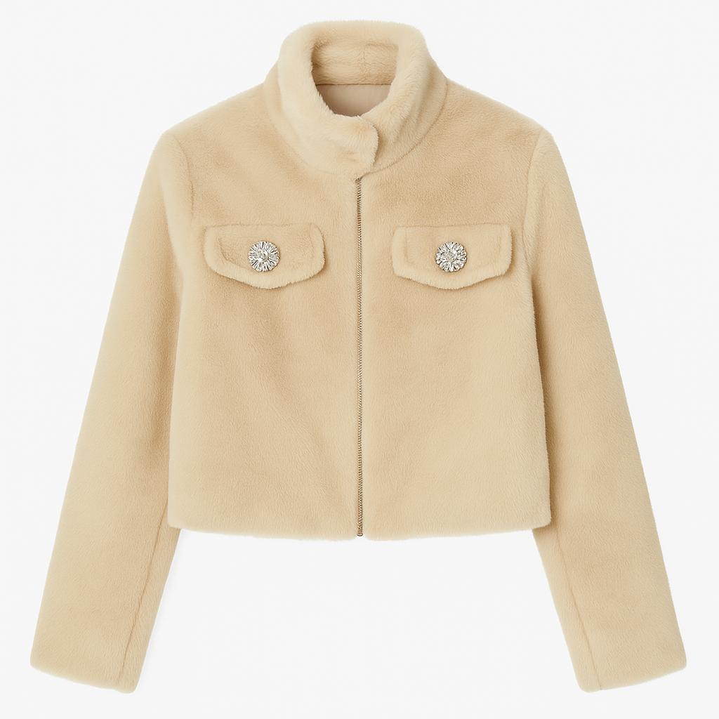 Casaco de pelo em cor pérola com bolsos de brilhantes.