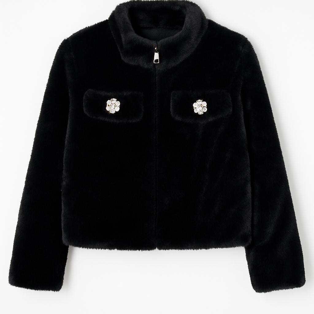 Casaco de pelo em cor preto com bolsos de brilhantes.