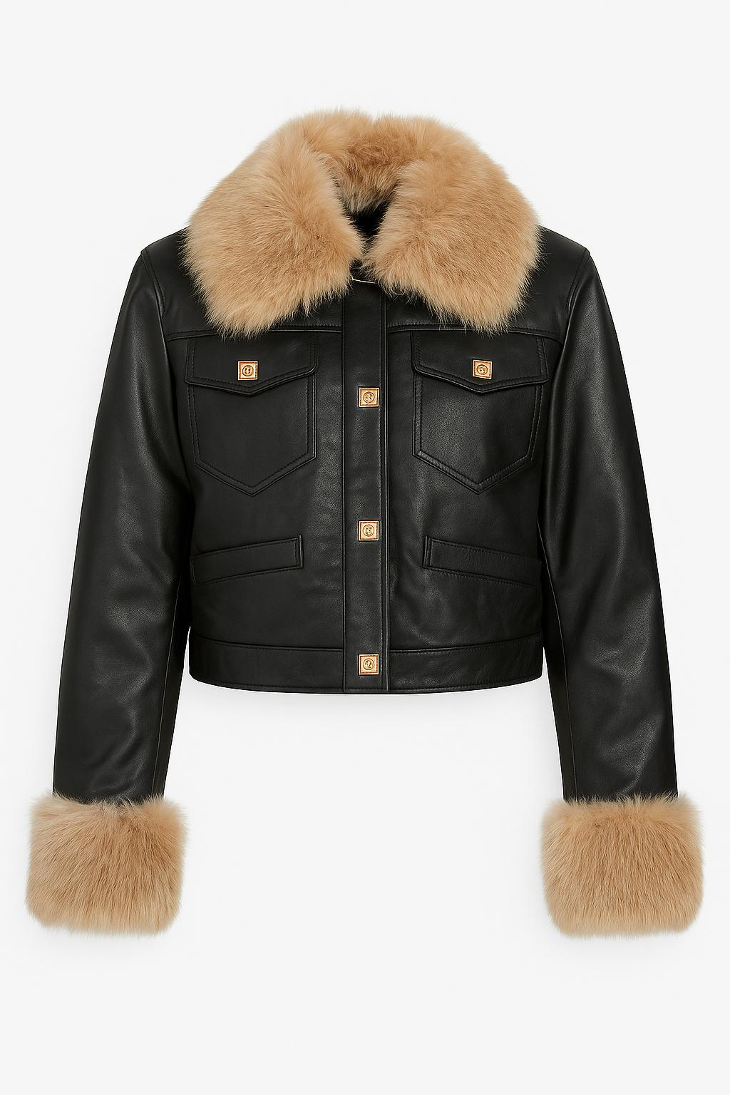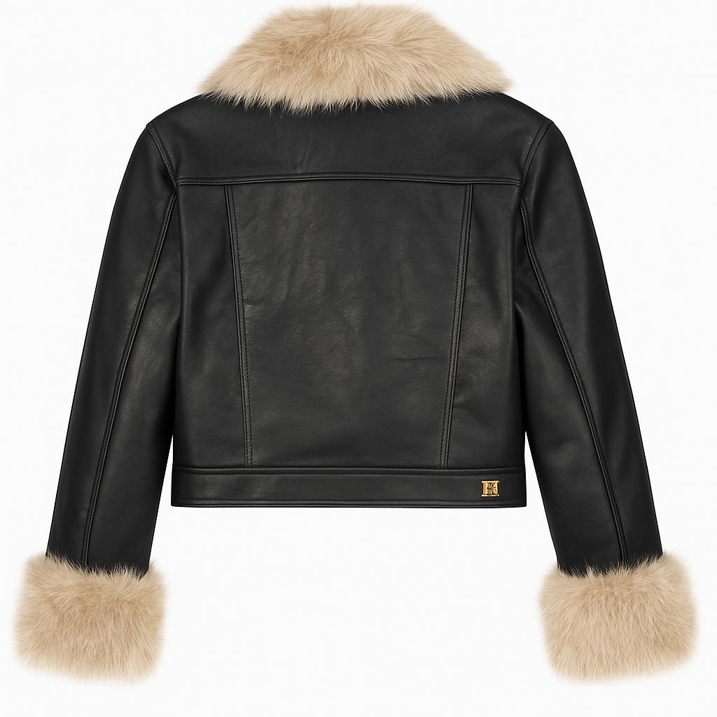 Jaqueta de pele preta com gola e punhos