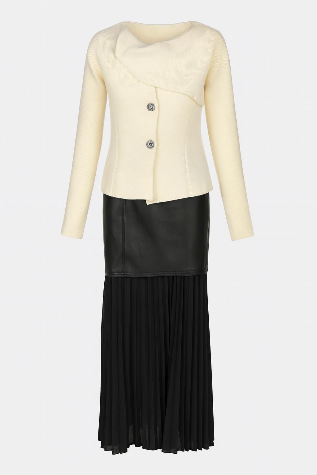 Saia em pele e tecido plissado com transparência.