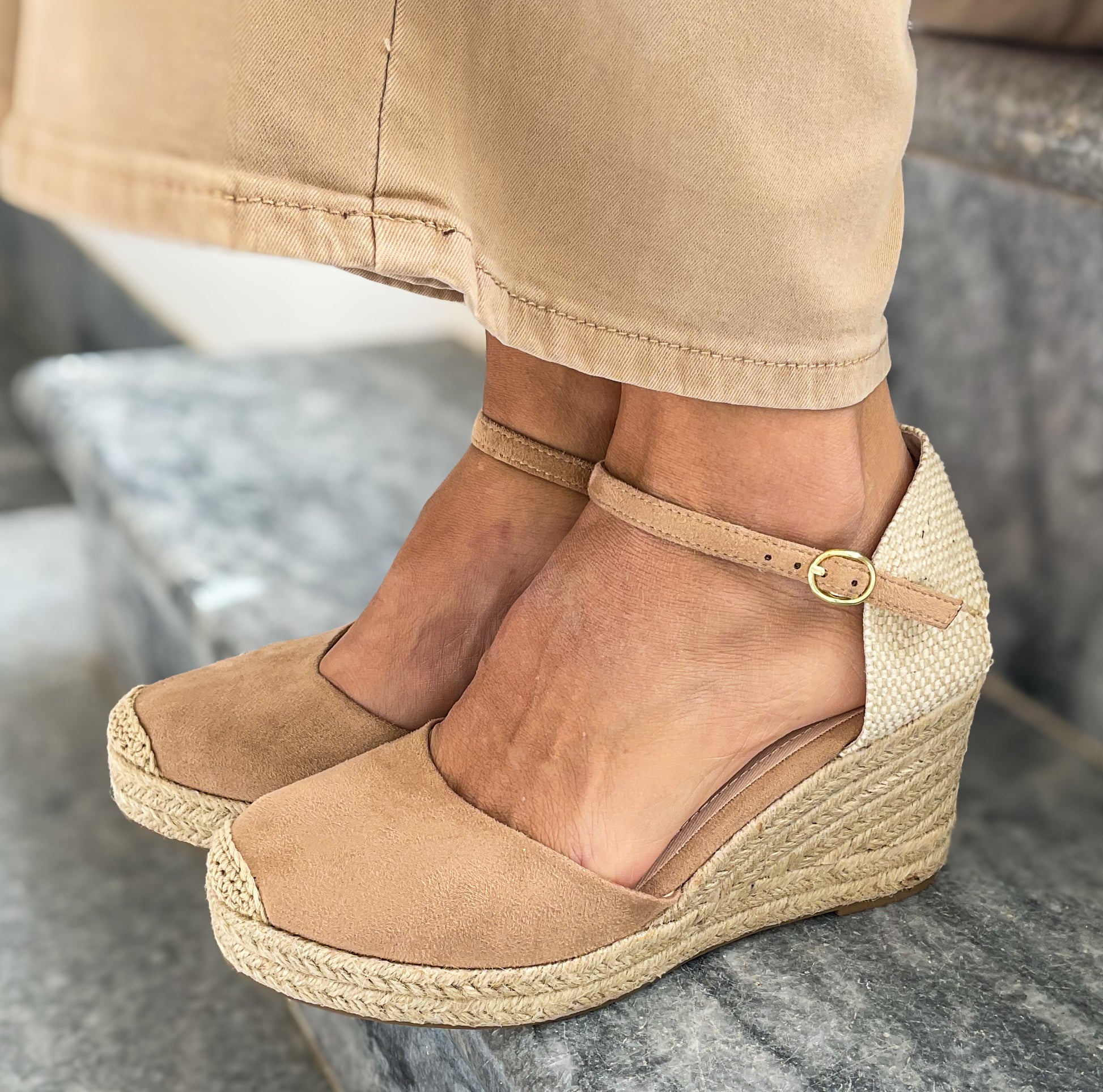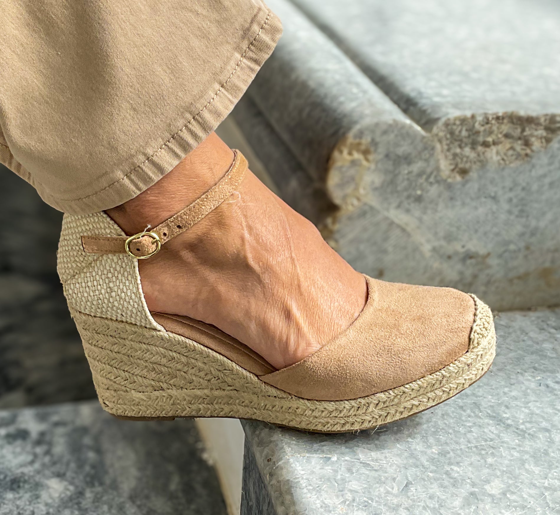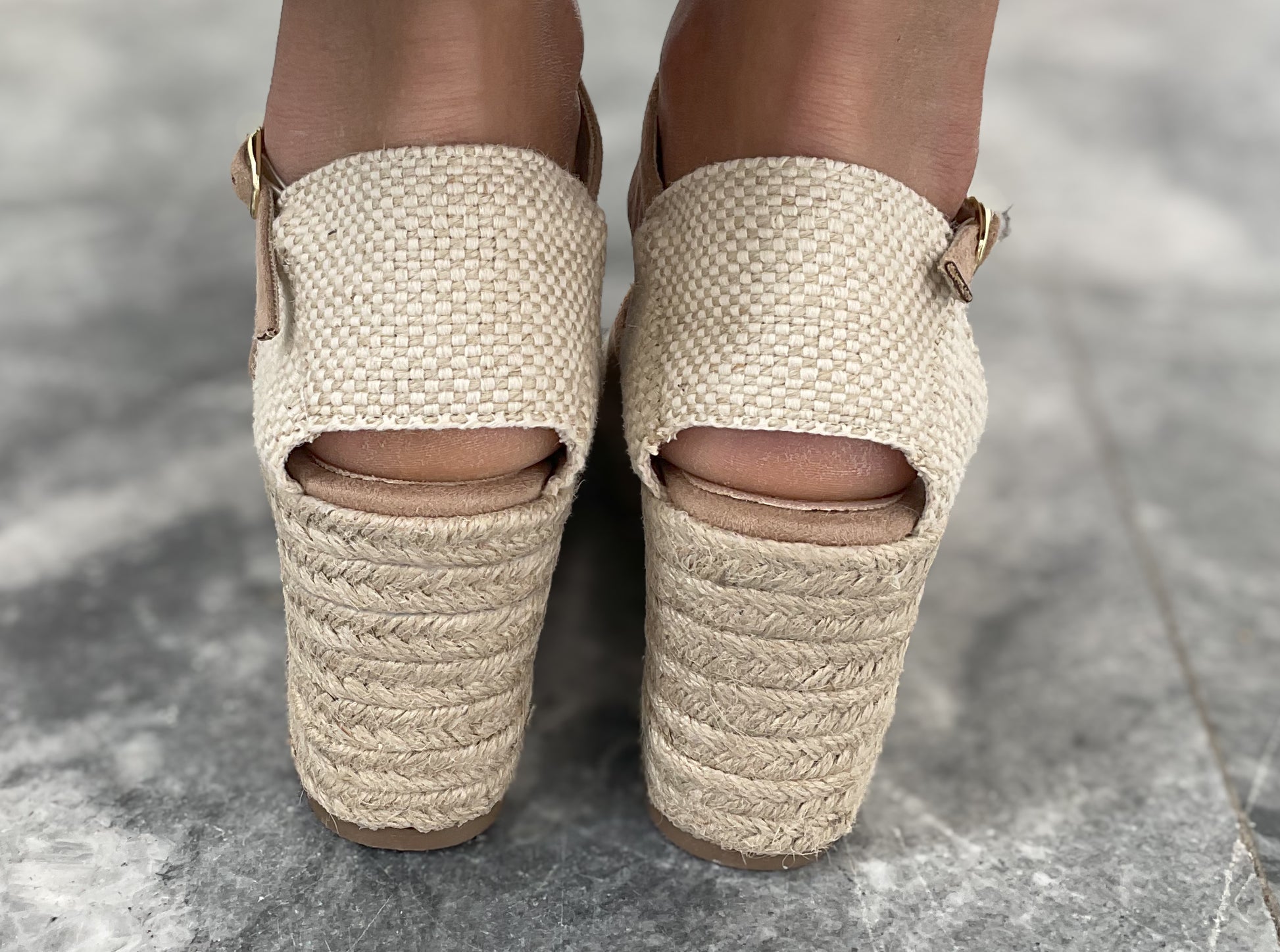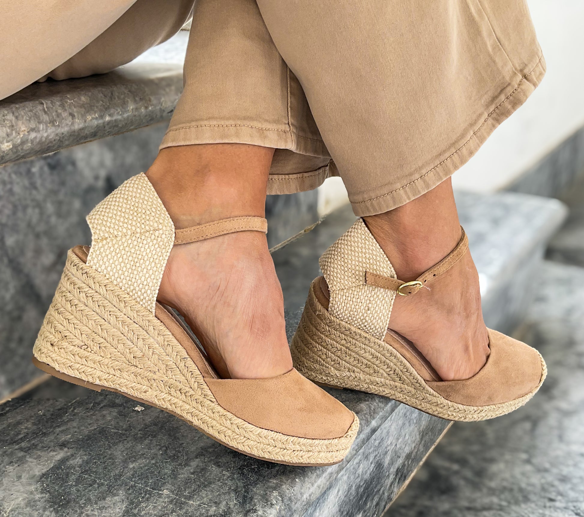 Sapato de Cunha de corda em cor bege e fivela que se adapta ao tornozelo.